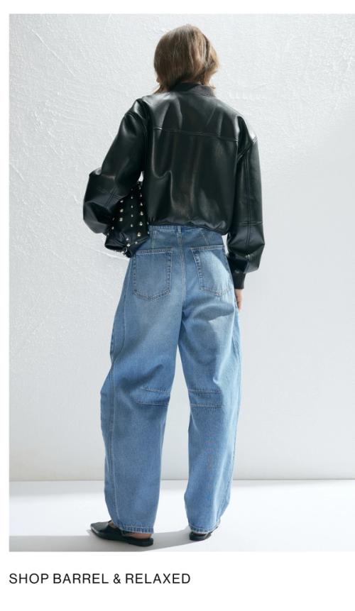 Model wearing on a black jacket, wearing denim jeans, standing against a minimalist white wall and gazing downward.