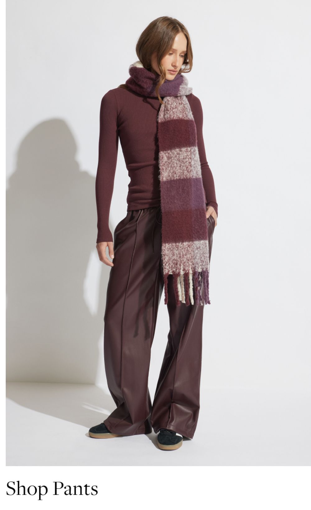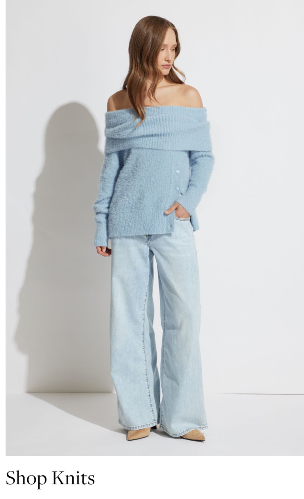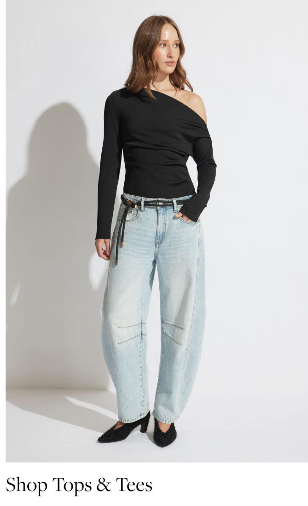 Model in white shirt, standing casually against a metal wall with her hand in her front pocket. Text reads "Shop tops"