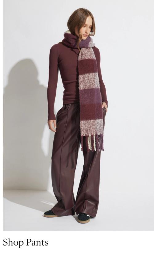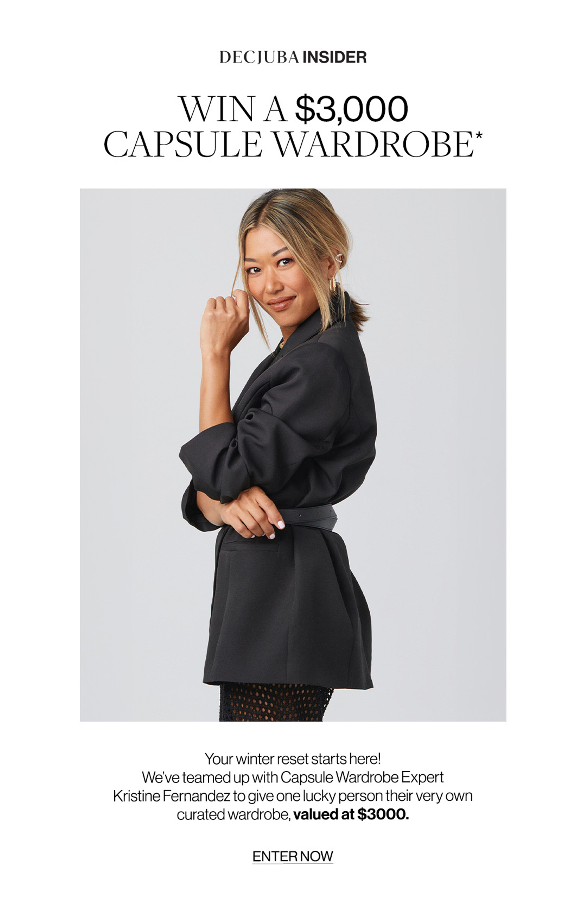 Model in a neutral coloured pinstripe suit posing against a metal wall with one hand in her pocket. Text reads ‘DLUXE basics: the latest essentials for this season and beyond.