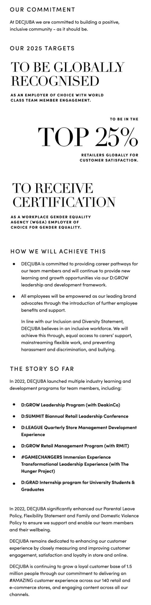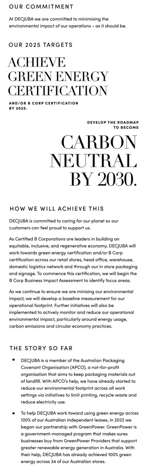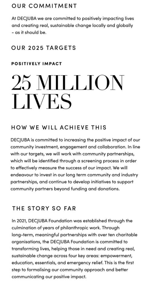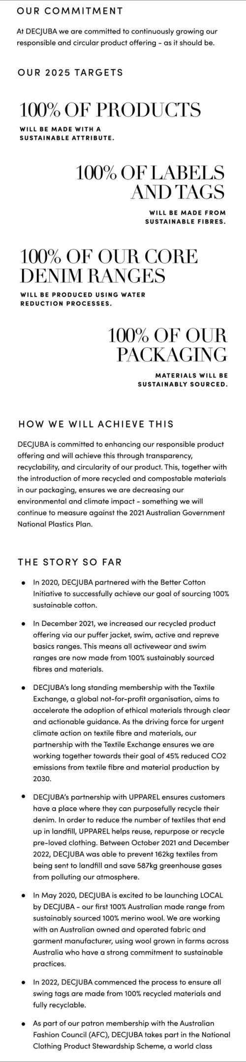 Established in 2021, the DECJUBA Sustainability Strategy focuses on five pillars: our product, our partners, our promise, our planet, and our people. Through our DECJUBA Sustainability Roadmap and Targets, a five year plan was established to ensure we remain accountable to our sustainability goals.