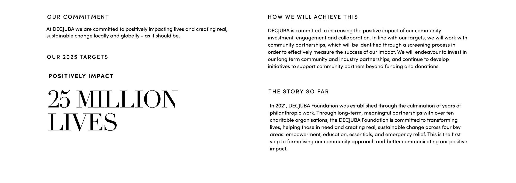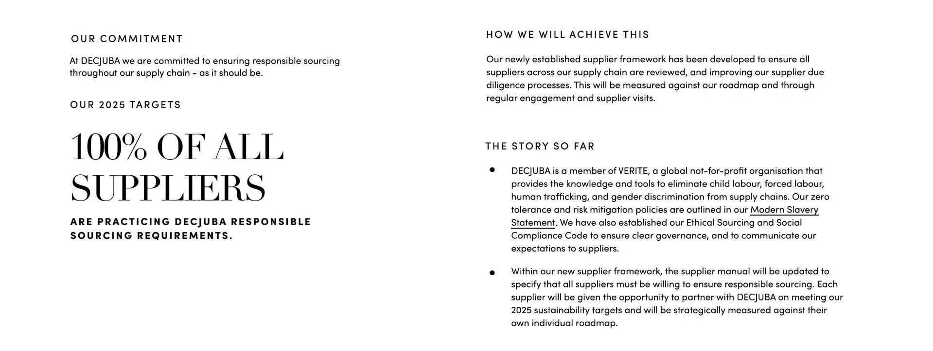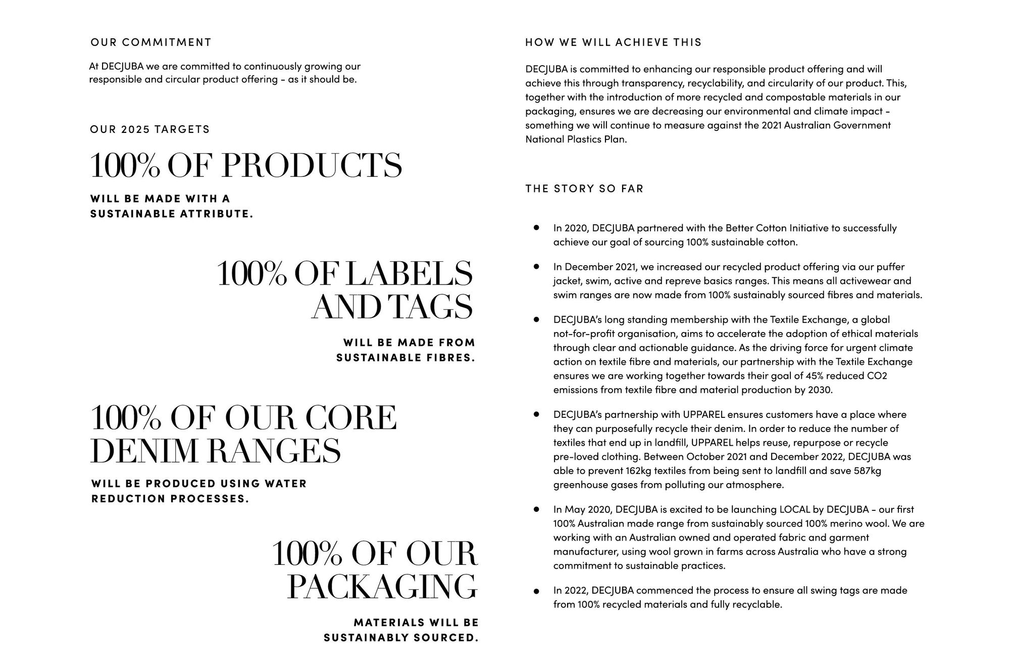 Established in 2021, the DECJUBA Sustainability Strategy focuses on five pillars: our product, our partners, our promise, our planet, and our people. Through our DECJUBA Sustainability Roadmap and Targets, a five year plan was established to ensure we remain accountable to our sustainability goals.