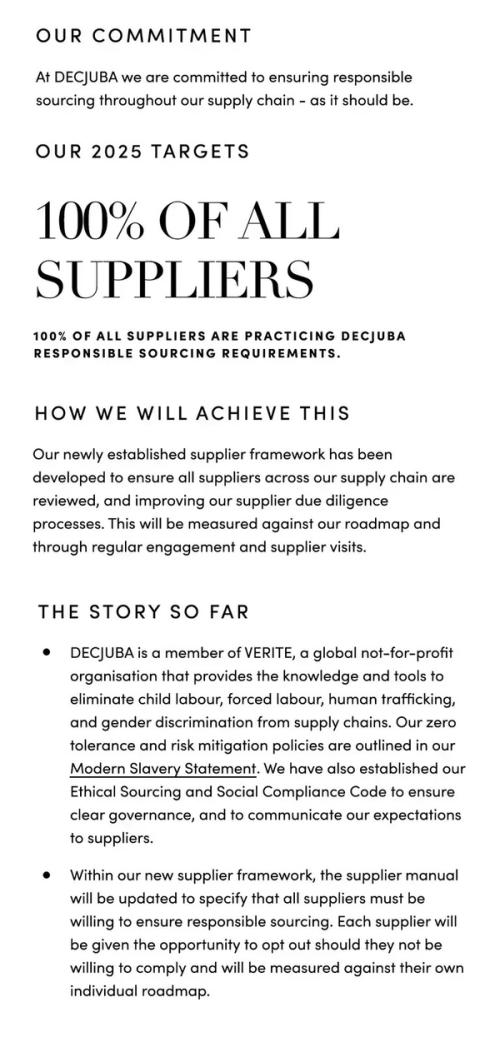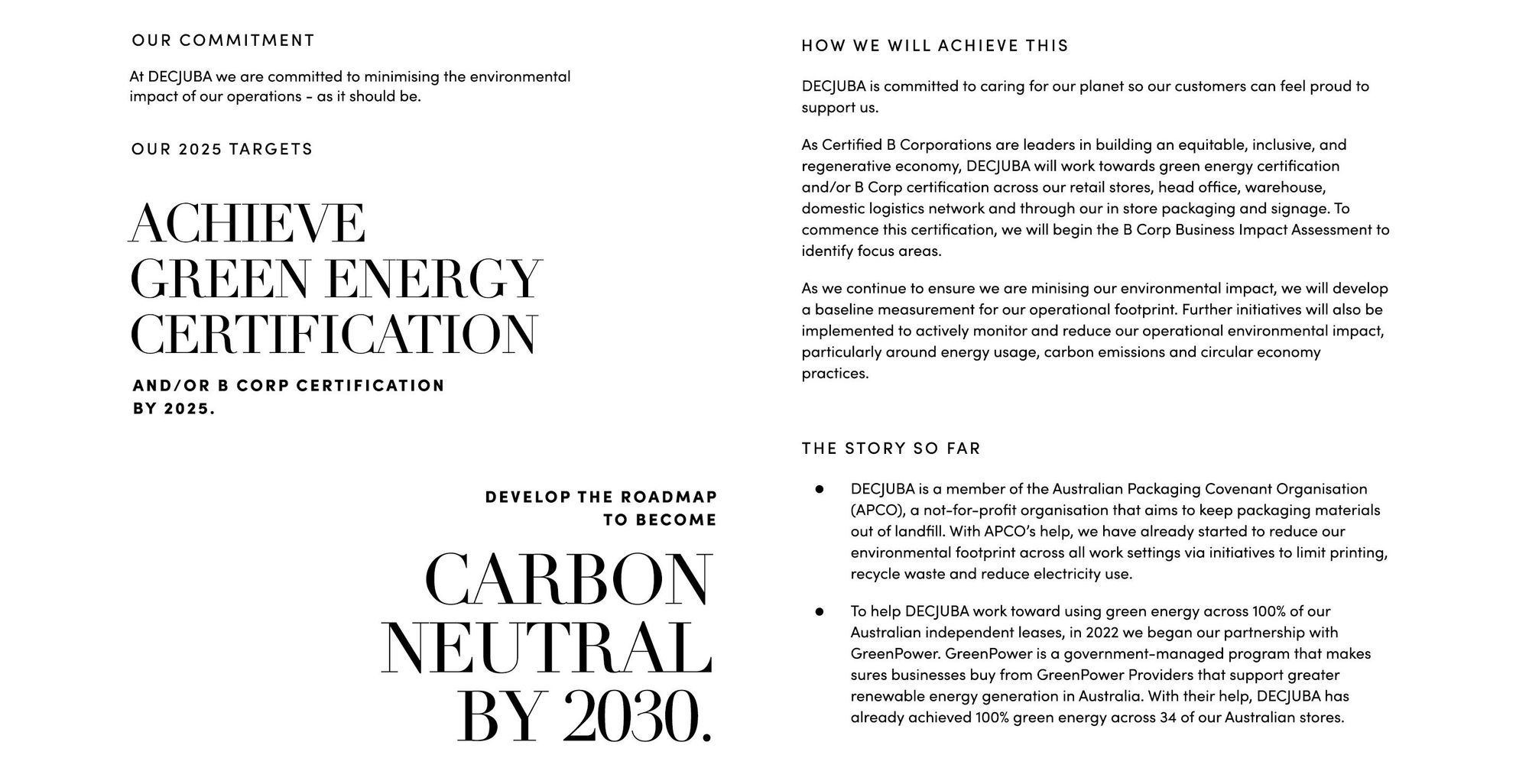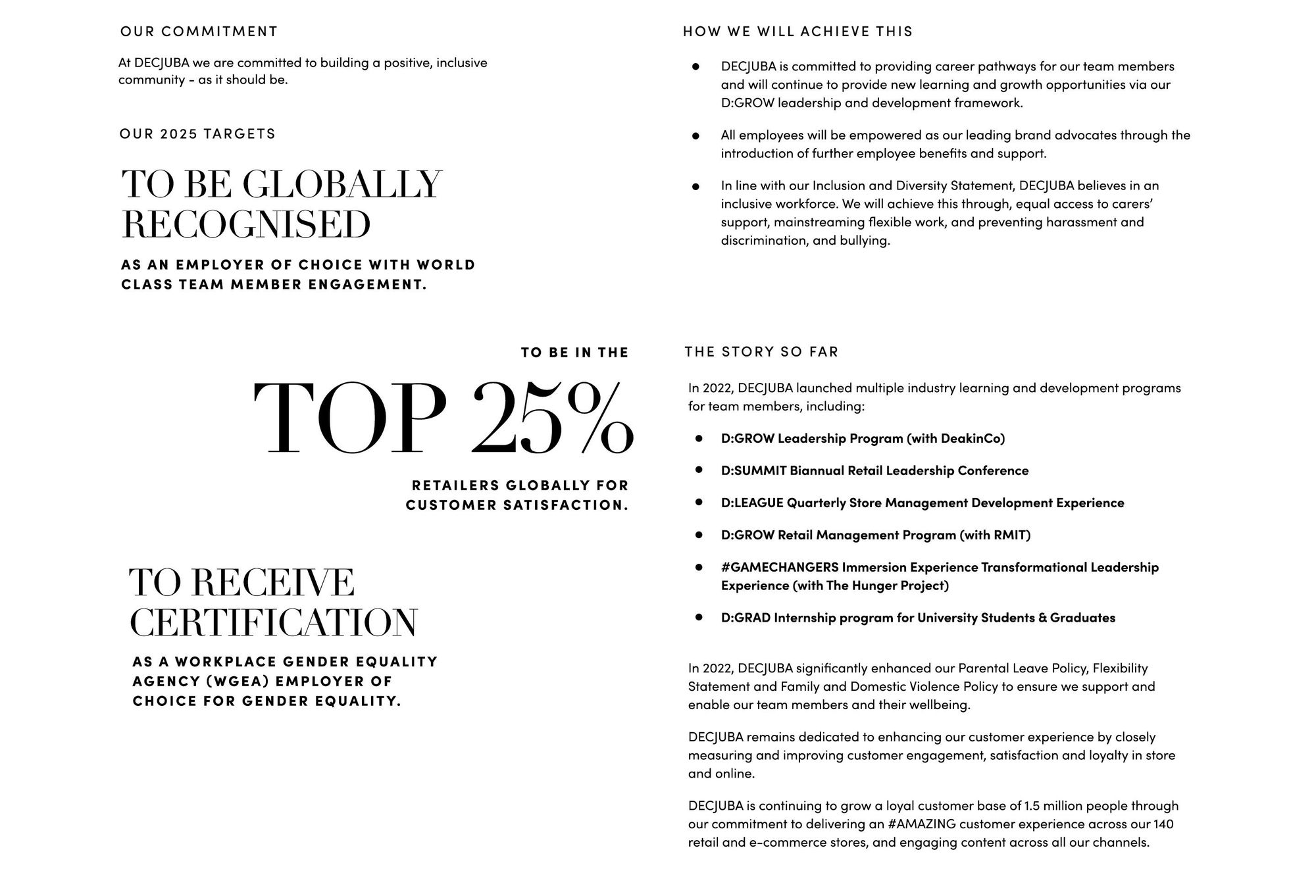 Established in 2021, the DECJUBA Sustainability Strategy focuses on five pillars: our product, our partners, our promise, our planet, and our people. Through our DECJUBA Sustainability Roadmap and Targets, a five year plan was established to ensure we remain accountable to our sustainability goals.