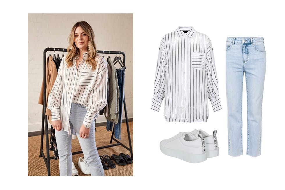 A: "Adding denim is my go-to when it comes to an oversized shirt. I love a half tuck. It's an in between oversized look. It covers the back and elongates the leg."
