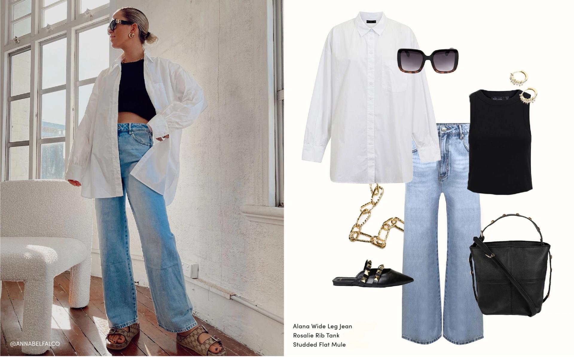 “For this last look, I’m wearing the Petra in the white colourway with a cropped tank and wide-leg denim for a more casual look, elevating this classic tank and jeans combo. I’ve styled it to wear open, but you play with buttoning the top section, leaving the middle-section undone for an alternate off-duty look.”