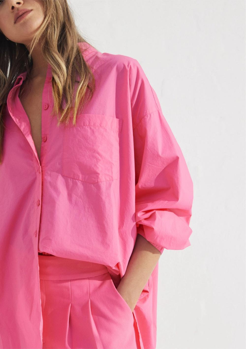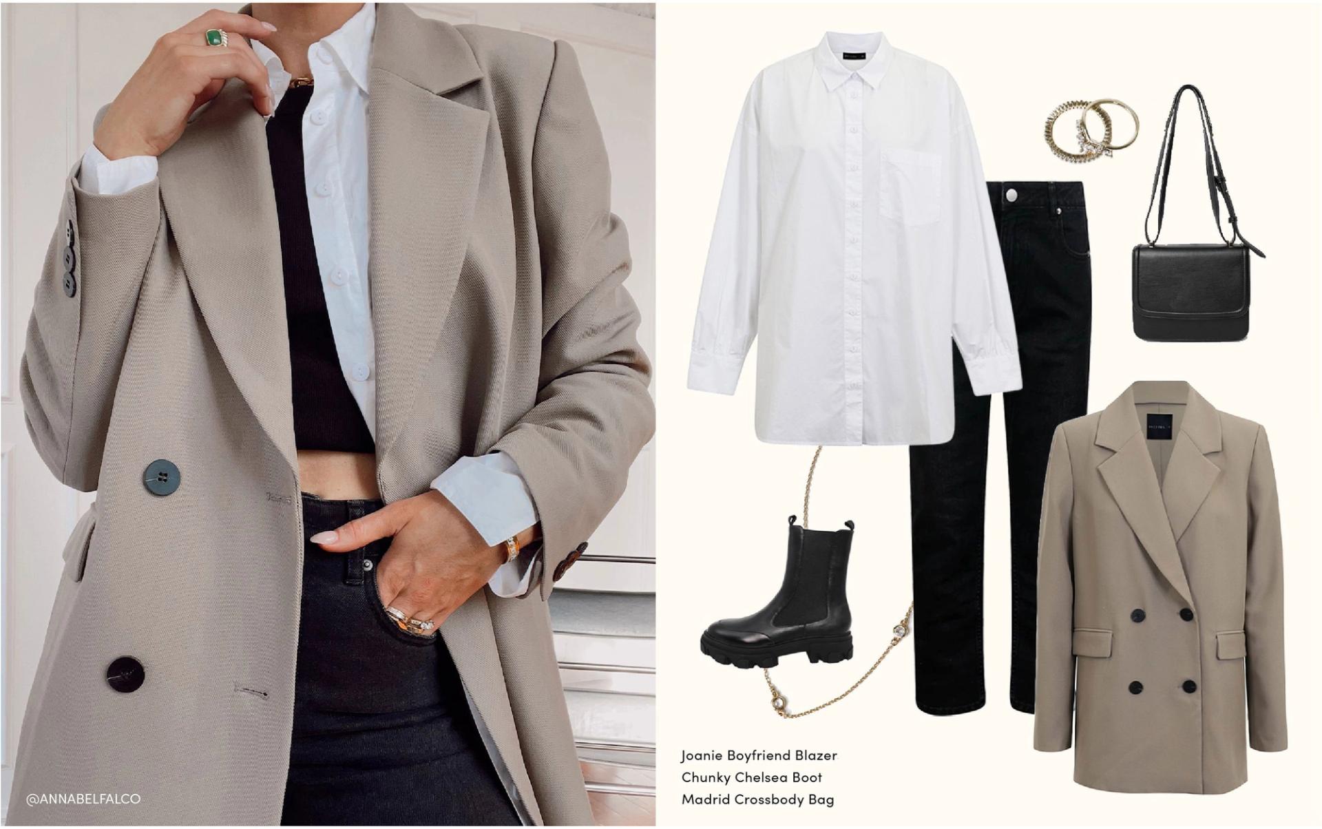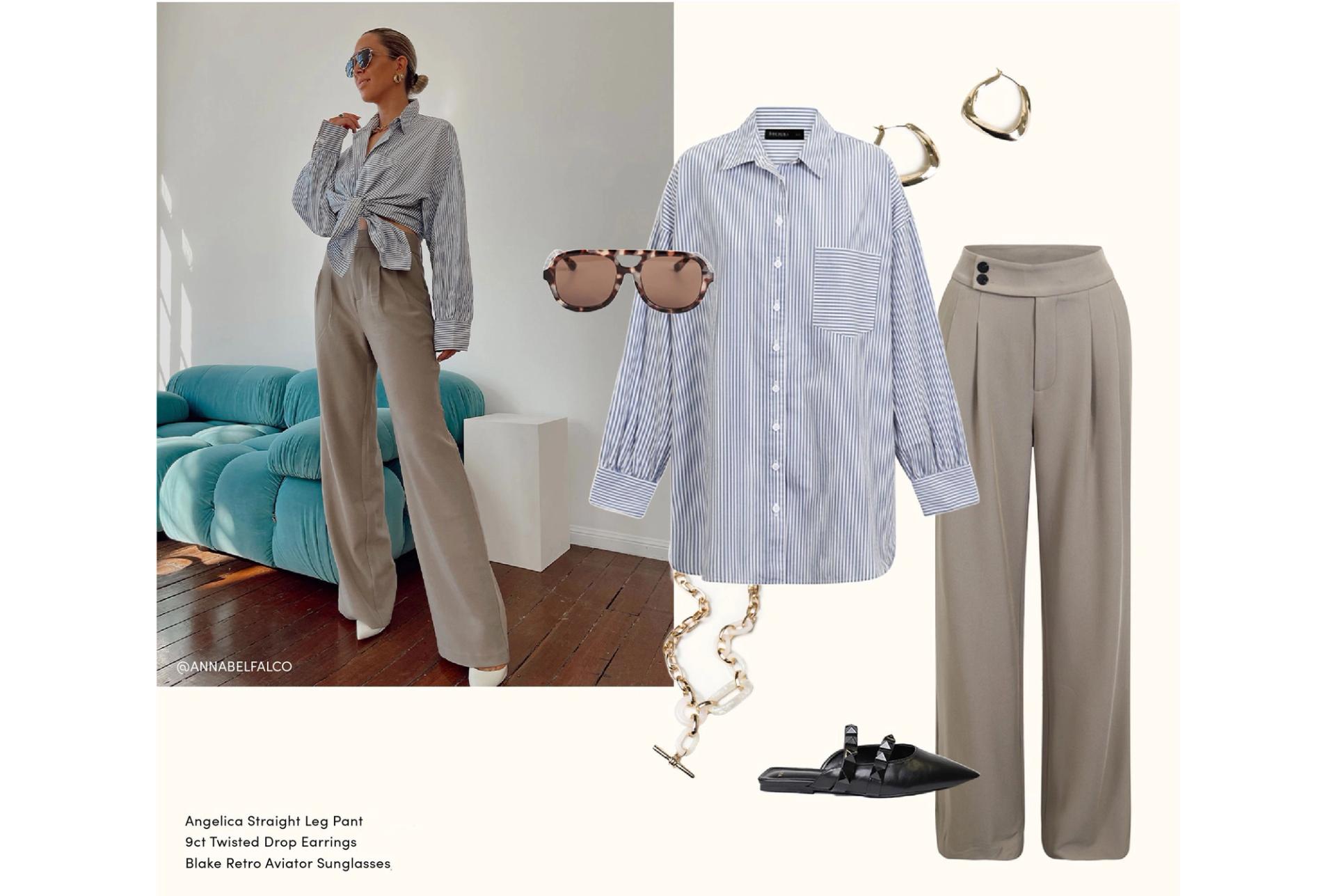 “The blue stripe shirt ensures a neutral suit is chic and not too corporate. Uncuffed, ruffled and slightly oversized is how I like to style it, tying at the front for an edgier look perfect for work or your weekend plans. You can play around with the neckline, waistline, and cuffs to find the perfect silhouette for you.”