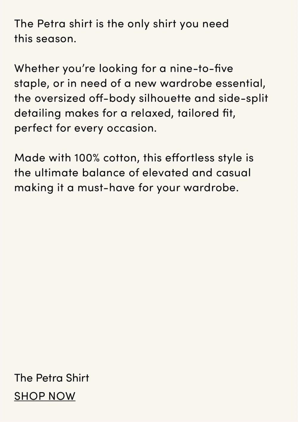 “I love layering my outfits to create flattering and interesting silhouettes, and this is exactly what I do with a white shirt. For this look, I’m layering the Petra over a cropped tee underneath a blazer. The same look can be achieved by styling it with a slip dress or over swimwear, for a more elevated look to your every day. This fashion essential has so many uses throughout the year!”
